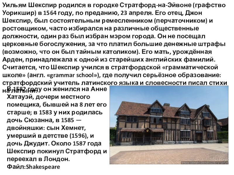 В 1582 году он женился на Анне Хатауэй, дочери местного помещика, бывшей на 8 лет его старше; в 1583 у них родилась дочь Сюзанна, в 1585 — двойняшки: сын Хемнет, умерший в детстве (1596), и дочь Джудит. Около 1587 года Шекспир покинул Стратфорд и переехал в Лондон.