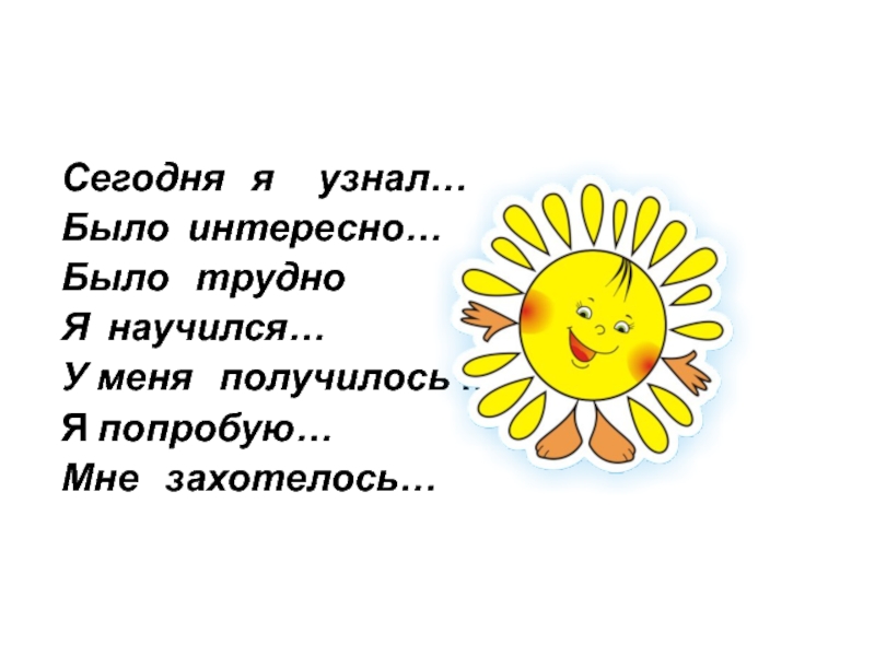 Сегодня  я   узнал… Было интересно… Было  трудно Я научился… У меня  получилось … Я попробую…