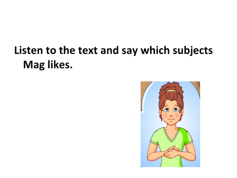 Слайд 14Listen to the text and say which subjects Mag likes.
