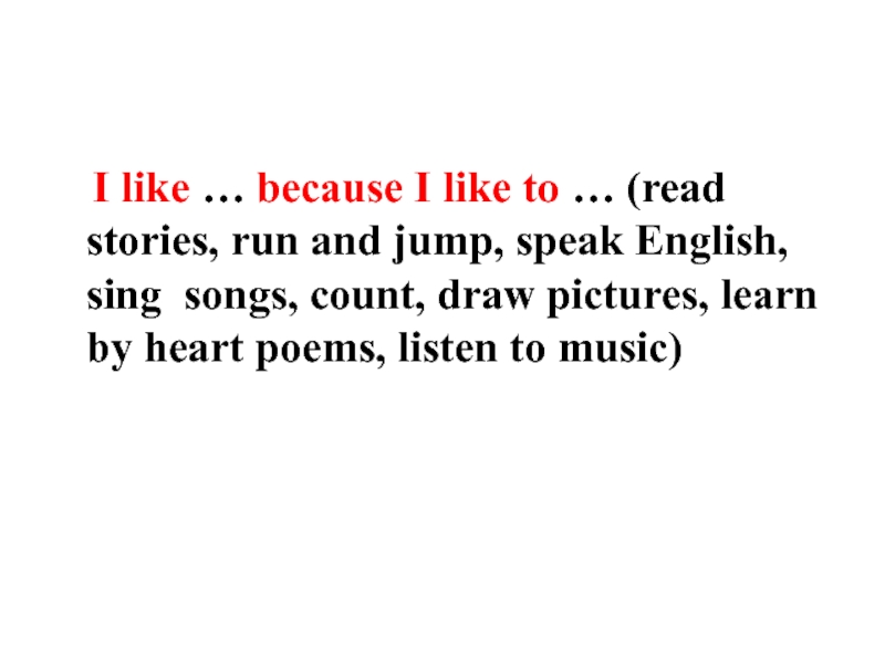 stories, run and jump, speak English, sing songs, count, draw pictures, learn by heart poems, listen to music)