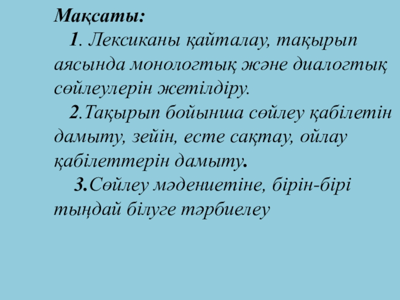 2.Тақырып бойынша сөйлеу қабілетін дамыту, зейін, есте сақтау, ойлау қабілеттерін дамыту.
