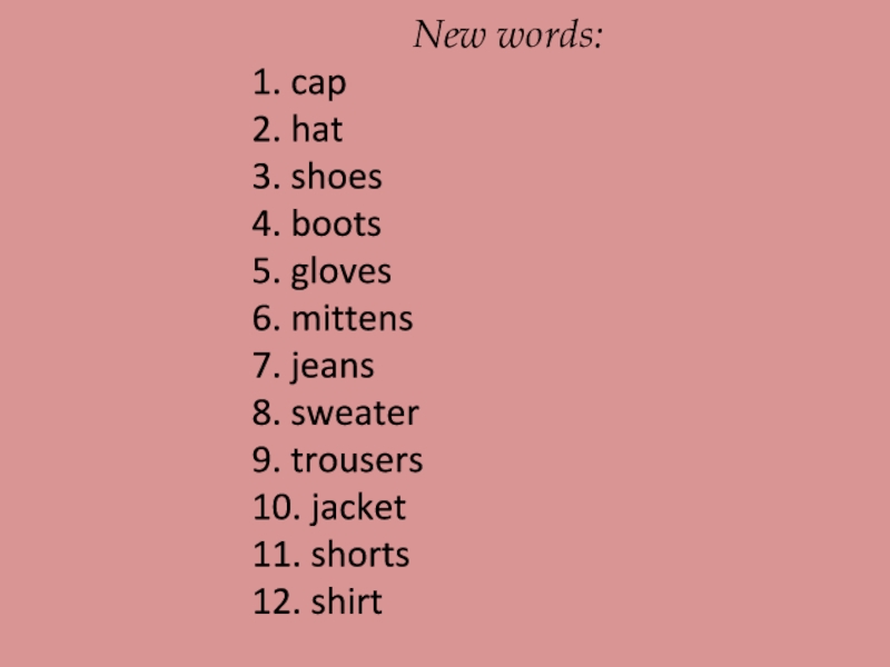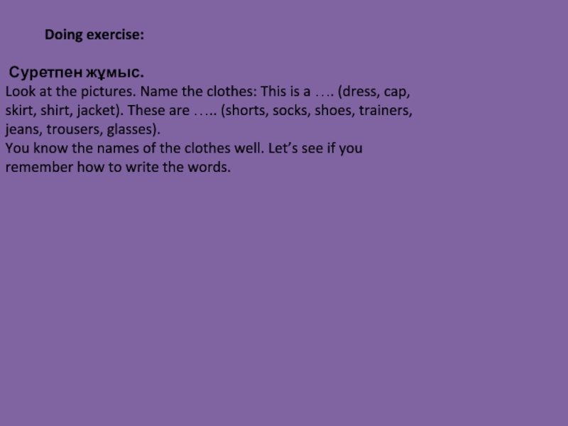 Look at the pictures. Name the clothes: This is a …. (dress, cap, skirt, shirt, jacket). These are ….. (shorts, socks, shoes, trainers, jeans, trousers, glasses).