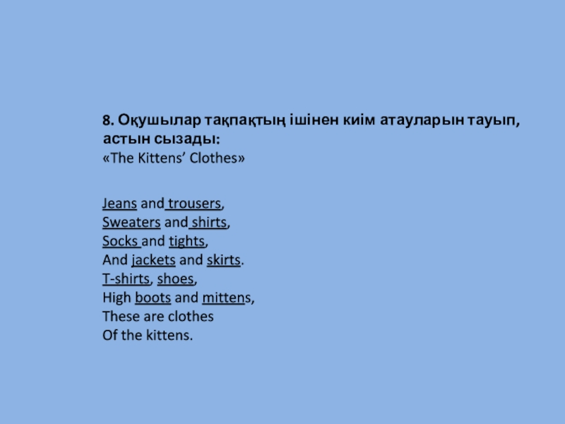Слайд 118. Оқушылар тақпақтың ішінен киім атауларын тауып, астын сызады: