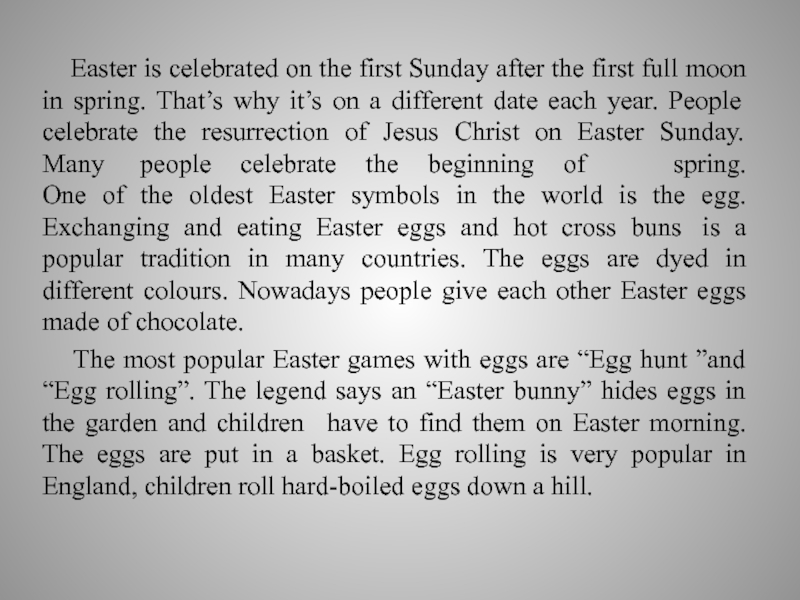 first full moon in spring. That’s why it’s on a different date each year. People celebrate the resurrection of Jesus Christ on Easter Sunday. Many  people celebrate the beginning of spring. One of the oldest Easter symbols in the world is the egg. Exchanging and eating Easter eggs and hot cross buns  is a popular tradition in many countries. The eggs are dyed in different colours. Nowadays people give each other Easter eggs made of chocolate.