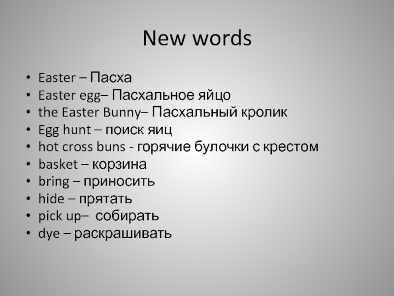 New wordsEaster – ПасхаEaster egg– Пасхальное яйцоthe Easter Bunny– Пасхальный кроликEgg hunt – поиск яицhot cross buns