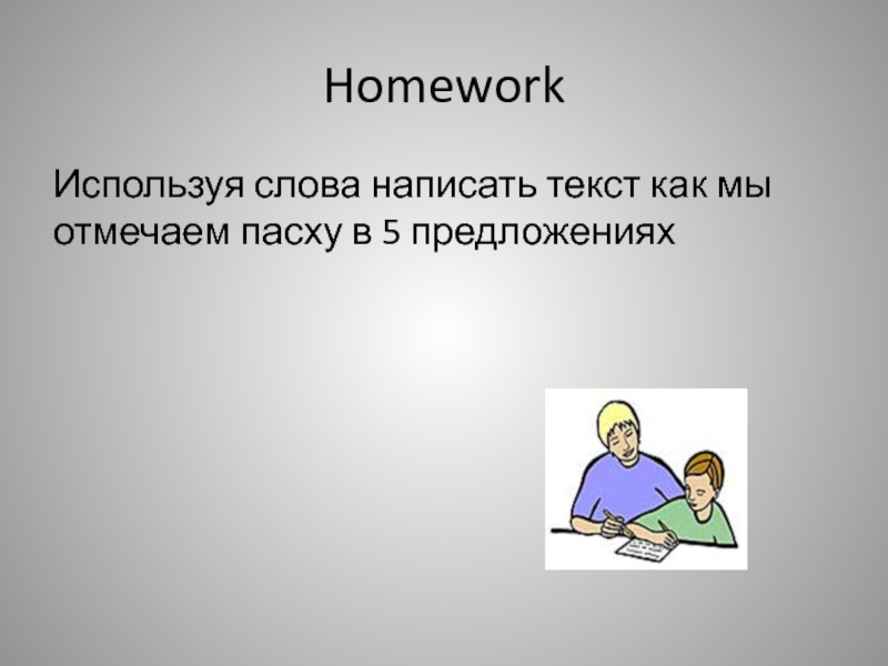 HomeworkИспользуя слова написать текст как мы отмечаем пасху в 5 предложениях