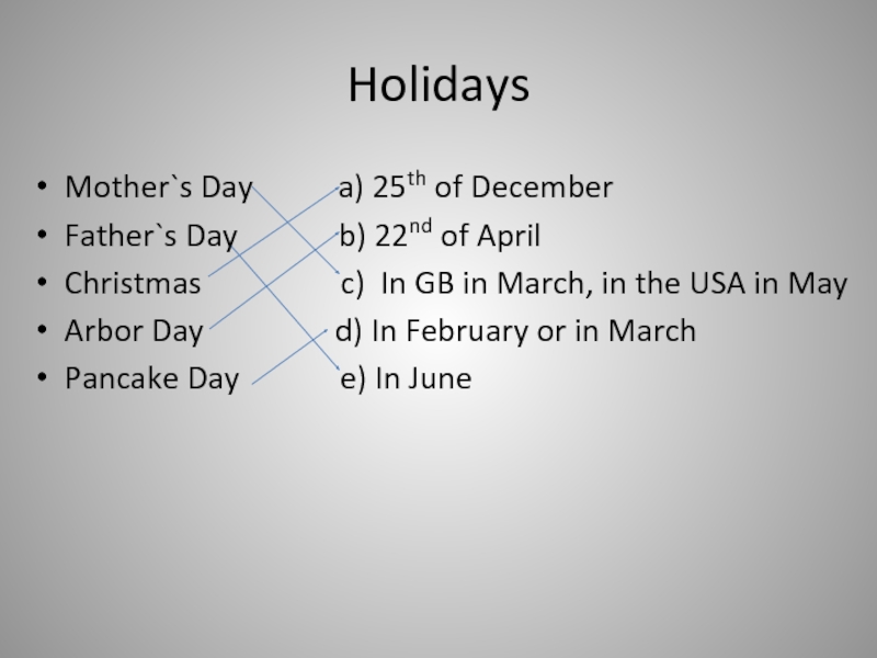 HolidaysMother`s Day a) 25th of December Father`s Day b) 22nd of AprilChristmas c)