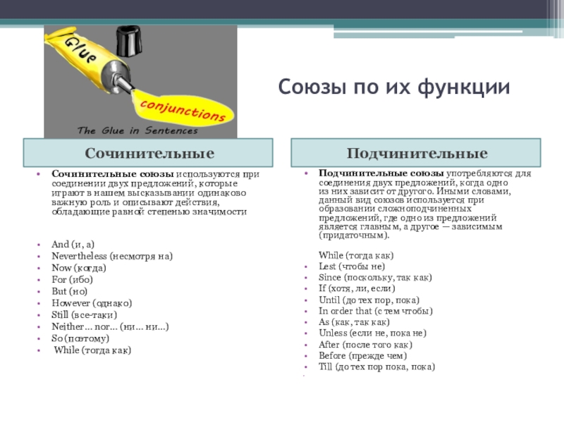 Подчинительные союзы употребляются для соединения двух предложений, когда одно из них зависит от другого. Иными словами, данный вид союзов используется при образовании сложноподчиненных предложений, где одно из предложений является главным, а другое — зависимым (придаточным).
