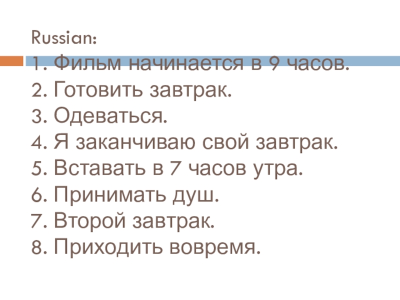 Слайд 6Russian: 1. Фильм начинается в 9 часов. 2. Готовить завтрак. 3. Одеваться. 4. Я заканчиваю