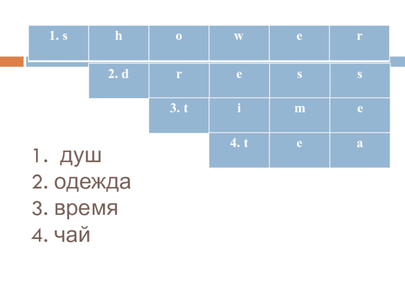 Слайд 11 1. душ 2. одежда 3. время 4. чай