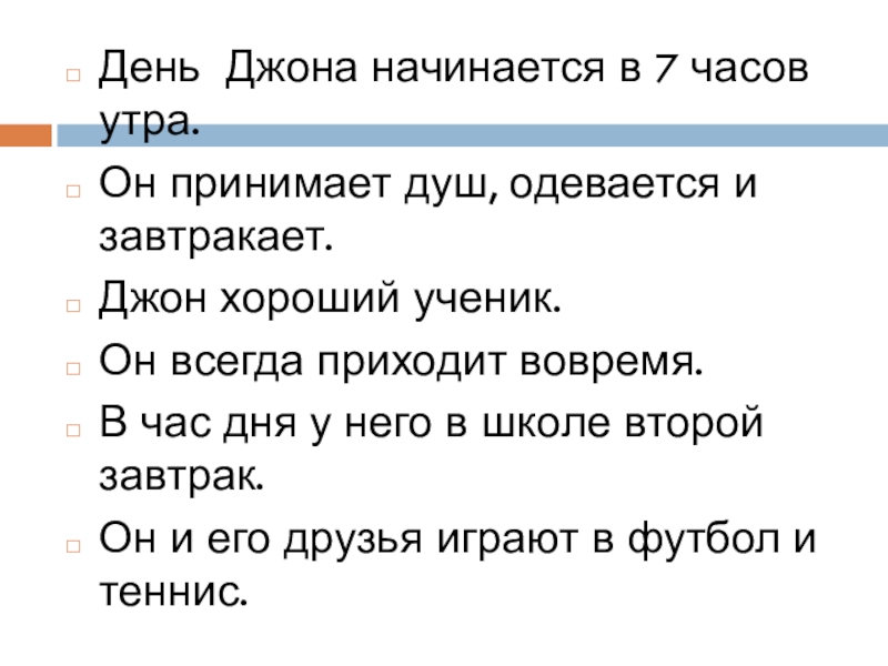 День Джона начинается в 7 часов утра.Он принимает душ, одевается и завтракает.Джон хороший ученик.Он всегда приходит вовремя.В