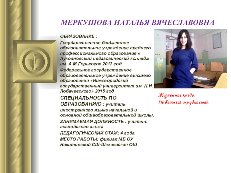 СПЕЦИАЛЬНОСТЬ ПО ОБРАЗОВАНИЮ : учитель иностранного языка начальной и основной общеобразовательной школы.