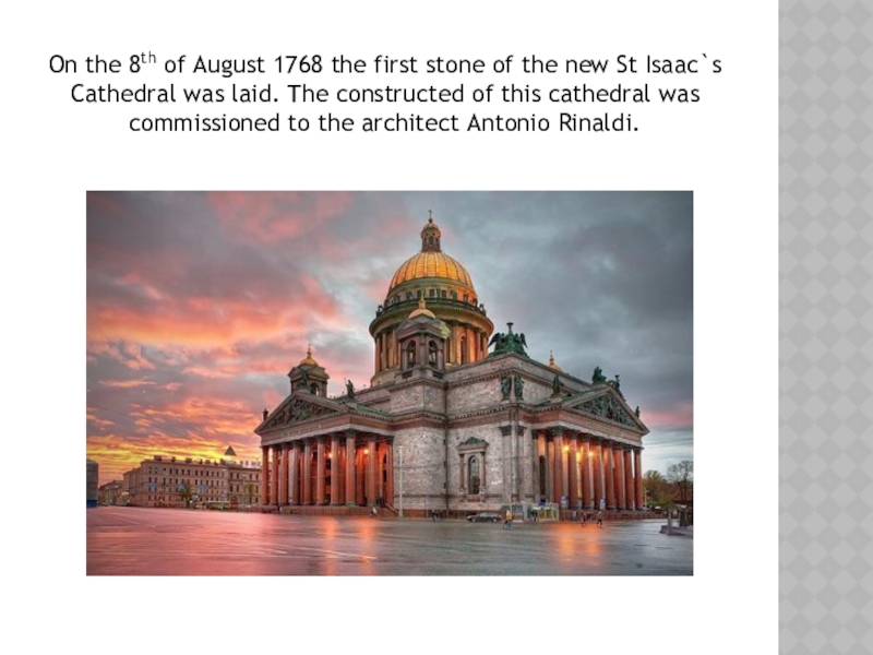 new St Isaac`s Cathedral was laid. The constructed of this cathedral was commissioned to the architect Antonio Rinaldi.