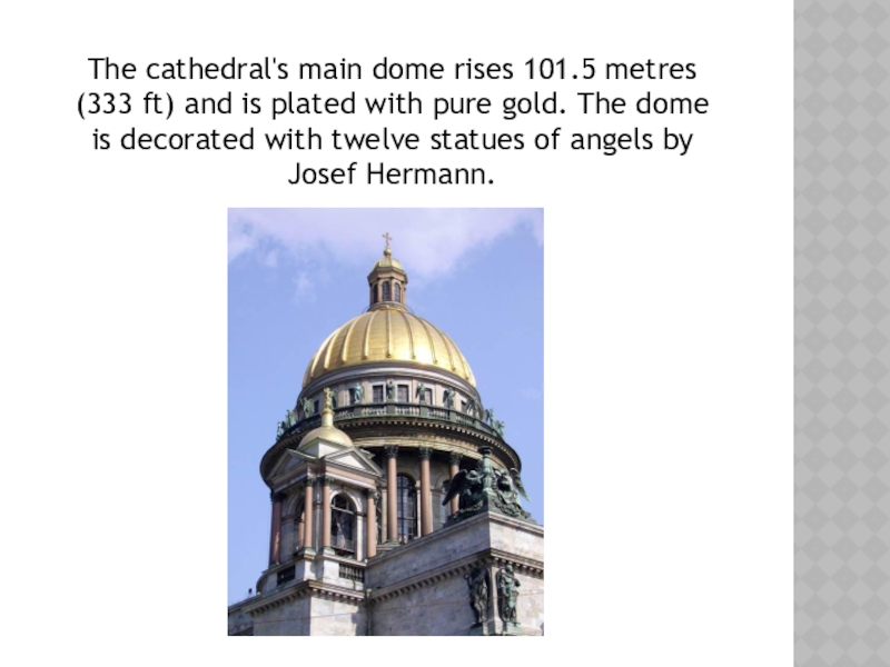 Слайд 8The cathedral's main dome rises 101.5 metres (333 ft) and is plated with pure gold. The