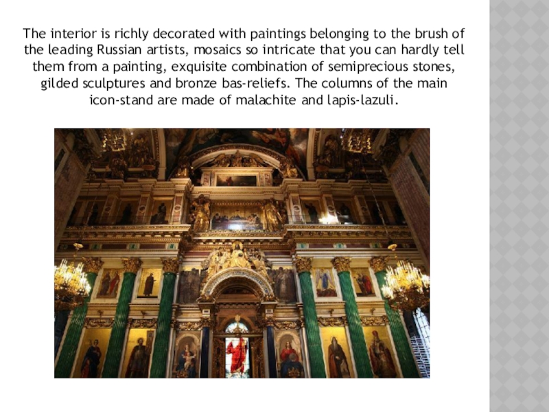 of the leading Russian artists, mosaics so intricate that you can hardly tell them from a painting, exquisite combination of semiprecious stones, gilded sculptures and bronze bas-reliefs. The columns of the main icon-stand are made of malachite and lapis-lazuli.