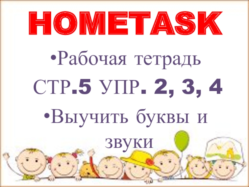HOMETASKРабочая тетрадь СТР.5 УПР. 2, 3, 4Выучить буквы и звуки
