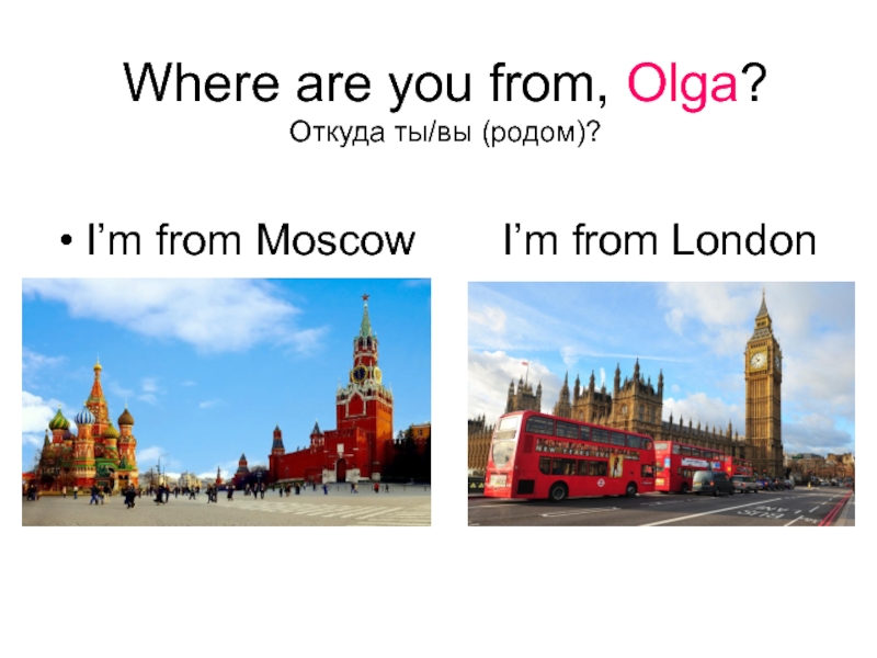 Where are you from, Olga? Откуда ты/вы (родом)?I’m from Moscow    I’m from London