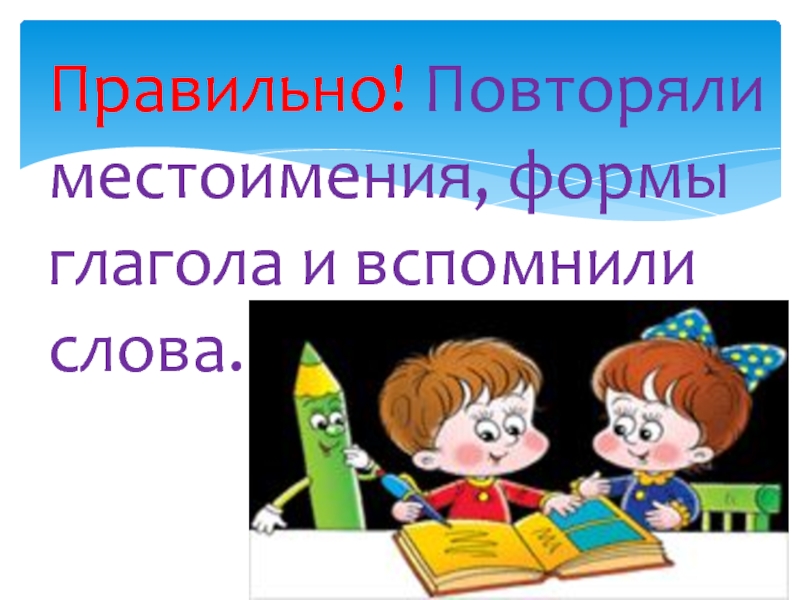 Слайд 42Правильно! Повторяли местоимения, формы глагола и вспомнили слова.