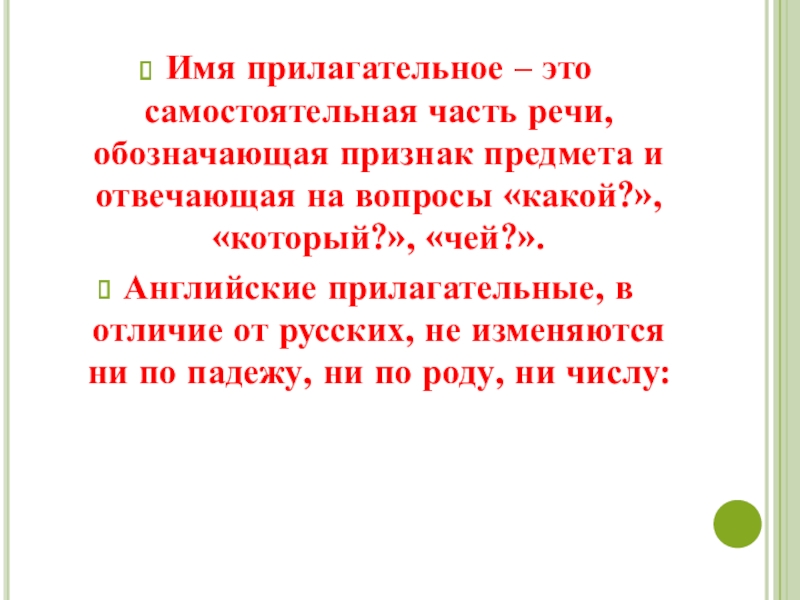 Имя прилагательное – это самостоятельная часть речи, обозначающая признак предмета и отвечающая на вопросы «какой?», «который?», «чей?».Английские прилагательные, в отличие от русских, не изменяются ни по падежу, ни по роду, ни числу: