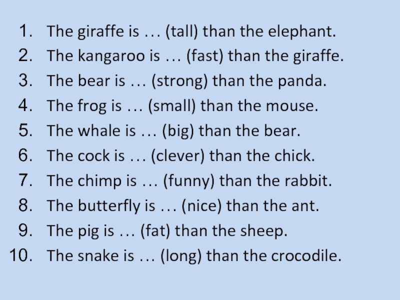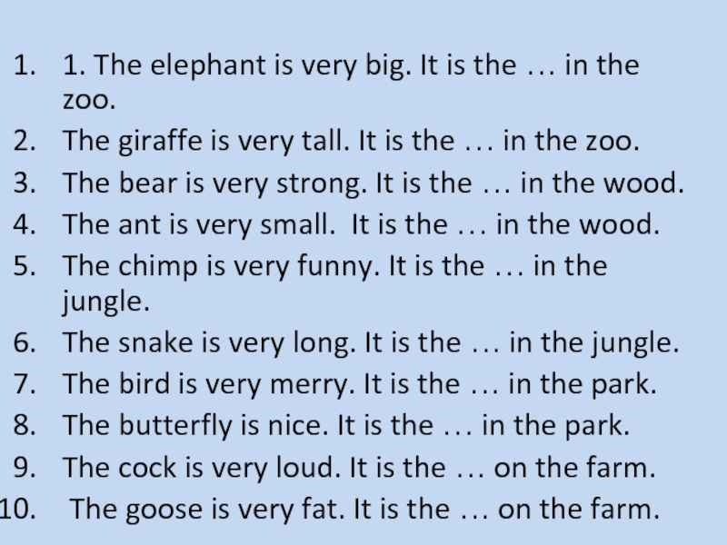 1. The elephant is very big. It is the … in the zoo.The giraffe is very tall.