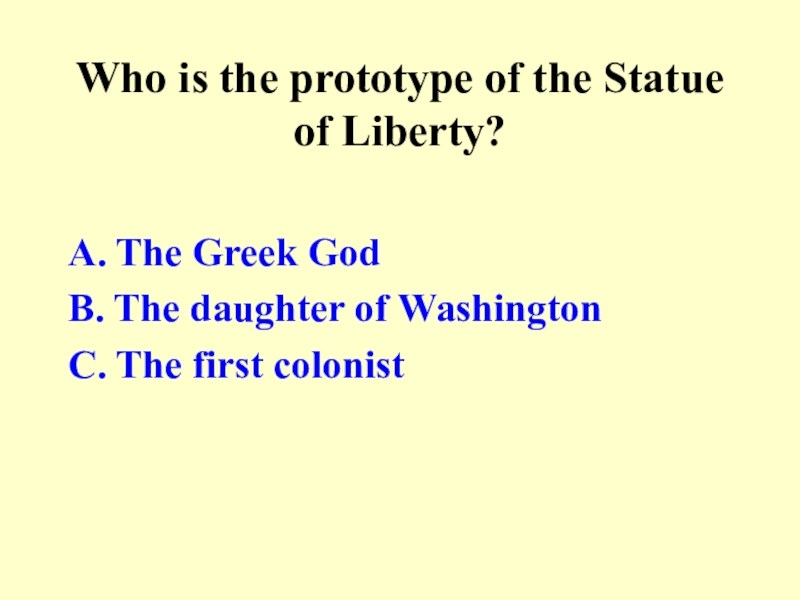 Who is the prototype of the Statue of Liberty?A. The Greek God B. The daughter of WashingtonC.
