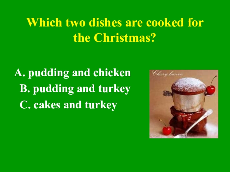 Which two dishes are cooked for the Christmas?pudding and chicken  B. pudding and turkeyC. cakes and