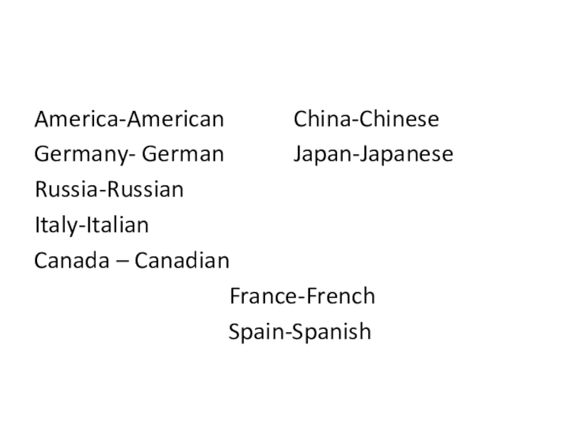America-American      China-ChineseGermany- German      Japan-JapaneseRussia-Russian