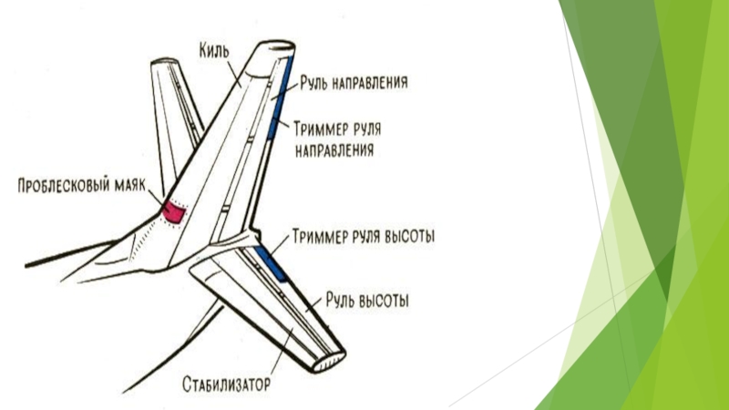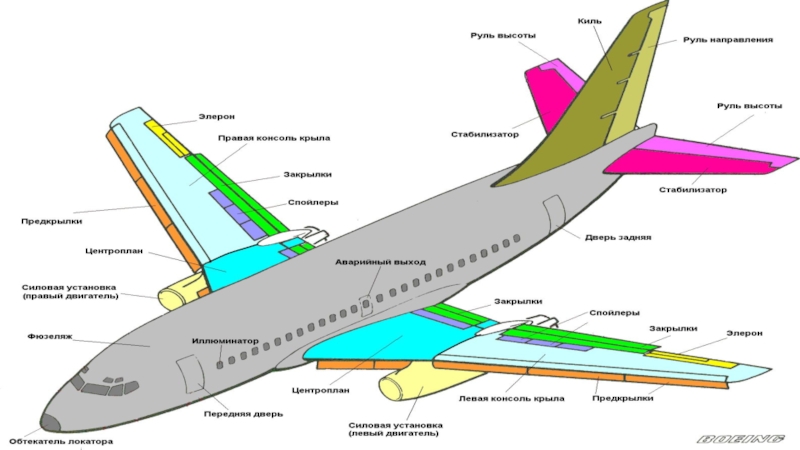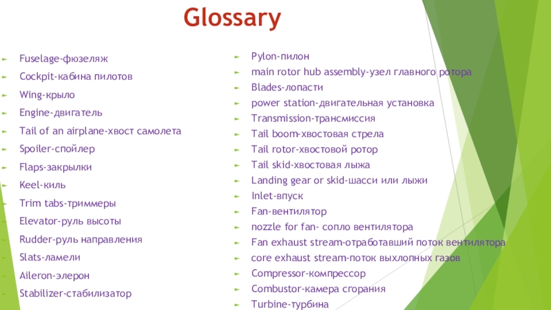 GlossaryFuselage-фюзеляжCockpit-кабина пилотовWing-крылоEngine-двигательTail of an airplane-хвост самолетаSpoiler-спойлерFlaps-закрылкиKeel-кильTrim tabs-триммерыElevator-руль высотыRudder-руль направленияSlats-ламелиAileron-элеронStabilizer-стабилизаторPylon-пилон