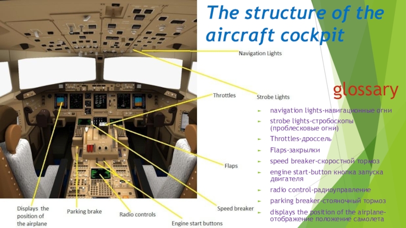 The structure of the aircraft cockpitglossarynavigation lights-навигационные огни strobe lights-стробоскопы (проблесковые огни)Throttles-дроссельFlaps-закрылкиspeed breaker-скоростной тормозengine start-button кнопка запуска