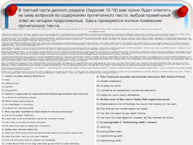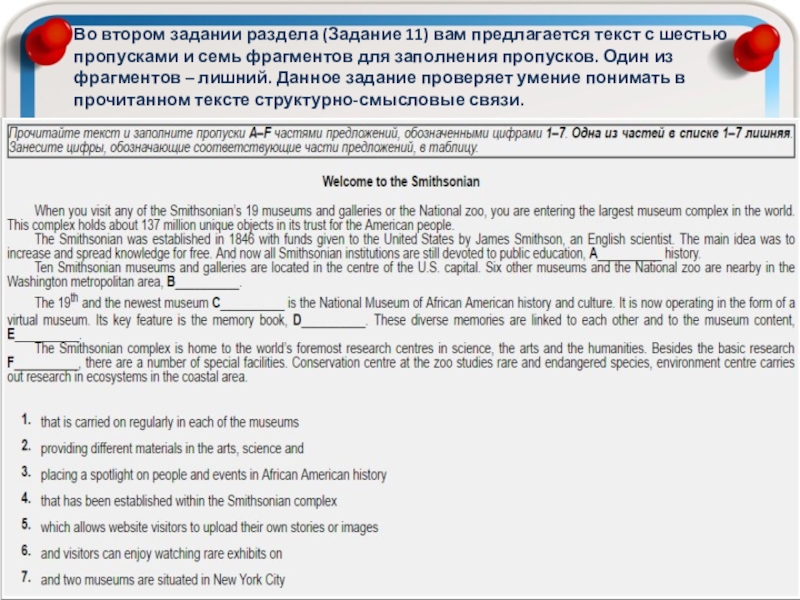 Слайд 10Во втором задании раздела (Задание 11) вам предлагается текст с шестью