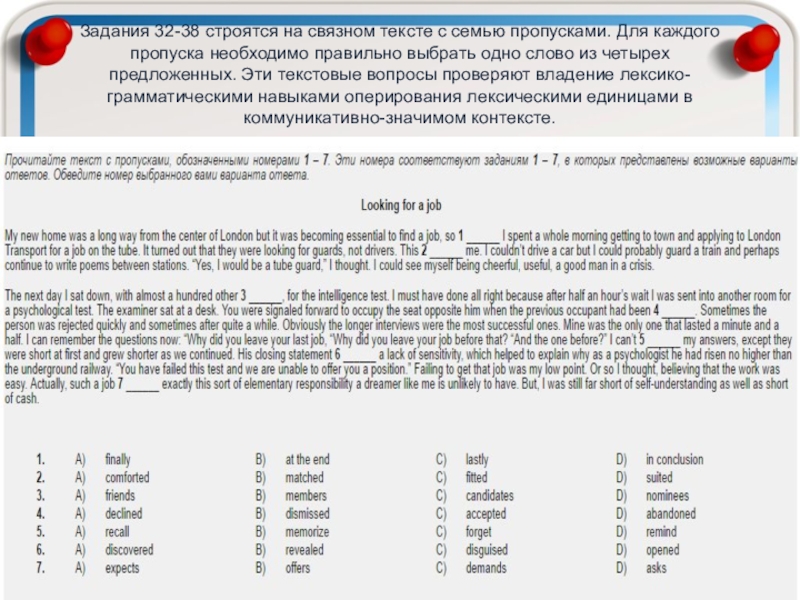 Слайд 15Задания 32-38 строятся на связном тексте с семью пропусками. Для каждого