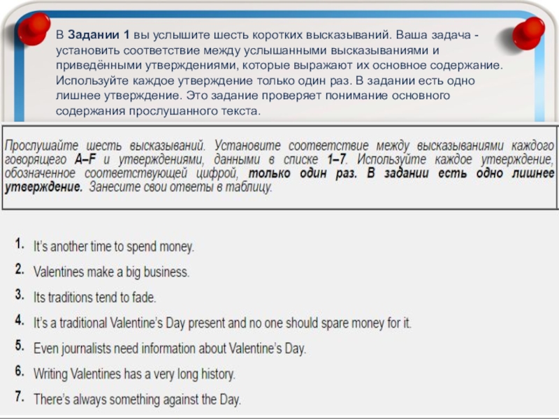 установить соответствие между услышанными высказываниями и приведёнными утверждениями, которые выражают их основное содержание. Используйте каждое утверждение только один раз. В задании есть одно лишнее утверждение. Это задание проверяет понимание основного содержания прослушанного текста.