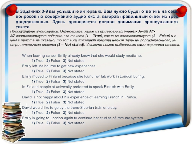 из приведённых утверждений соответствуют содержанию прослушанного текста, какие не соответствуют и о чём в тексте не сказано, т. е. на основании текста нельзя дать ни положительного, ни отрицательного ответа. Это задание проверяет понимание запрашиваемой информации.