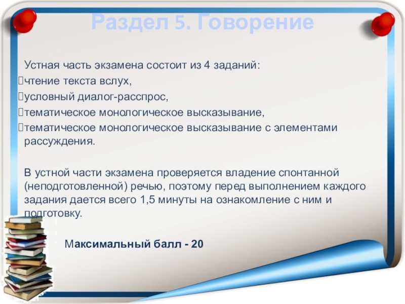 Раздел 5: Устная часть (41-44), чтение текста, выяснение информации, монологическое высказывание по заданной теме, монологическое высказывание с элементами рассуждения.