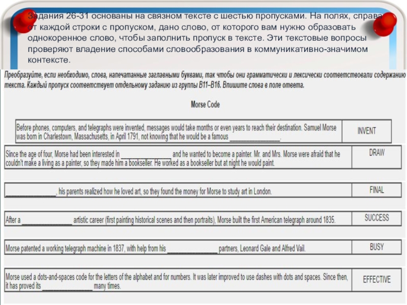 Слайд 14Задания 26-31 основаны на связном тексте с шестью пропусками. На полях,