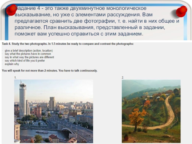 это также двухминутное монологическое высказывание, но уже с элементами рассуждения. Вам предлагается сравнить две фотографии, т. е. найти в них общее и различное. План высказывания, представленный в задании, поможет вам успешно справиться с этим заданием.