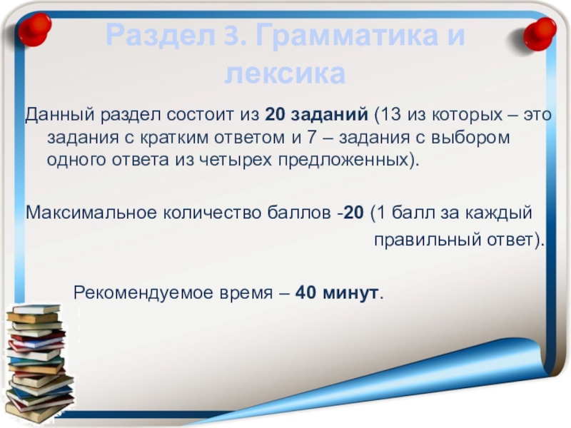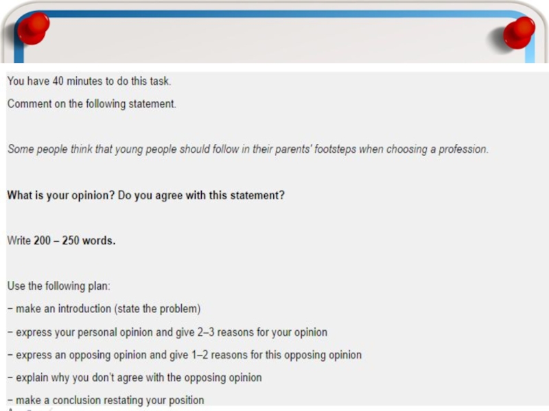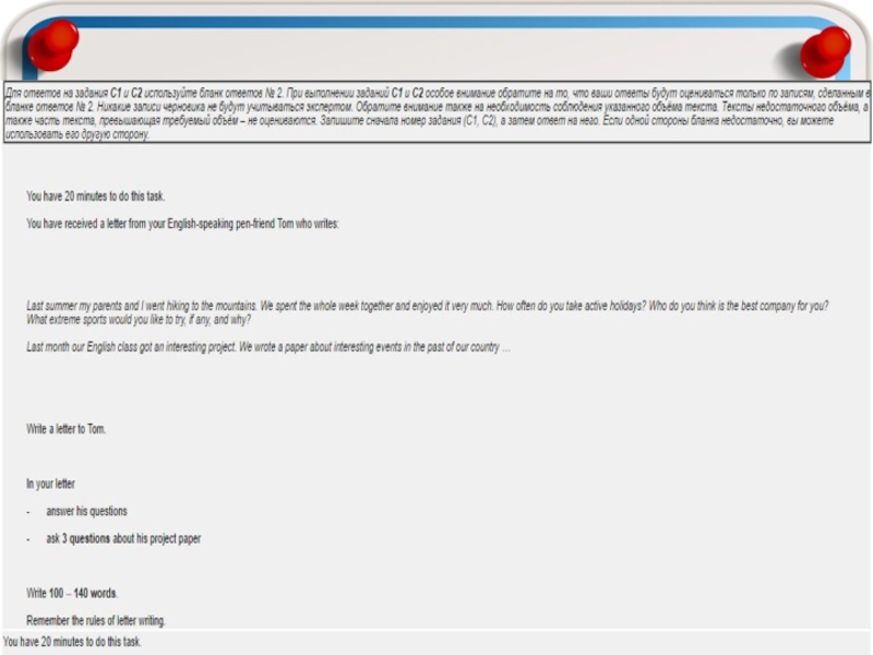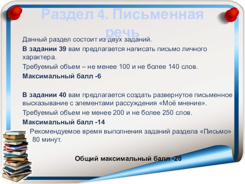 Раздел 4: Письмо (39–40), состоит из двух заданий – написание личного письма и высказывание с элементами рассуждения.