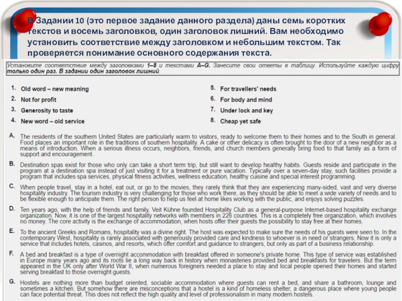 текстов и восемь заголовков, один заголовок лишний. Вам необходимо установить соответствие между заголовком и небольшим текстом. Так проверяется понимание основного содержания текста.