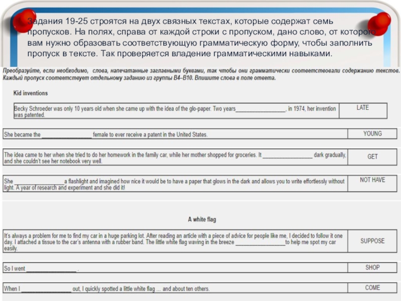 Слайд 13Задания 19-25 строятся на двух связных текстах, которые содержат семь пропусков.