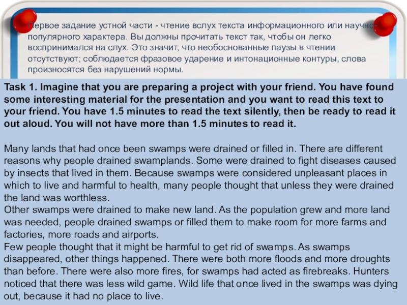 Слайд 20Первое задание устной части - чтение вслух текста информационного или научно-популярного