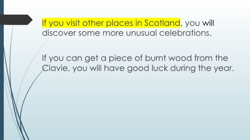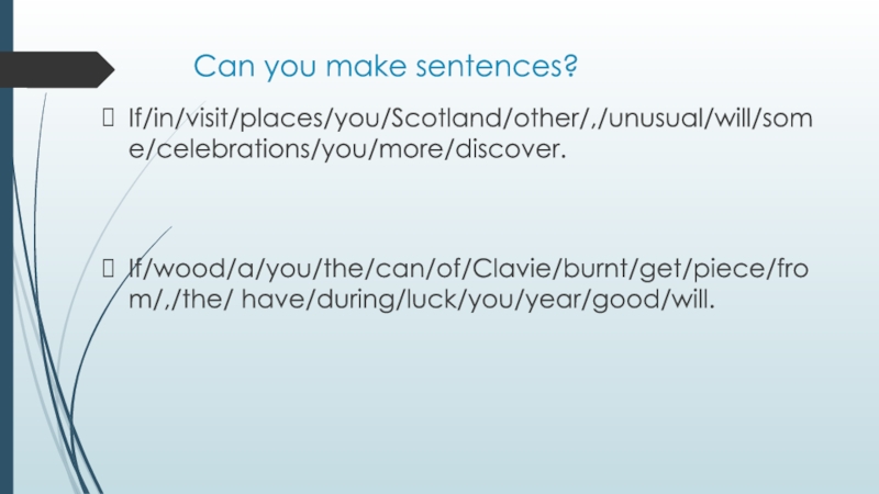 Can you make sentences?If/in/visit/places/you/Scotland/other/,/unusual/will/some/celebrations/you/more/discover.If/wood/a/you/the/can/of/Clavie/burnt/get/piece/from/,/the/ have/during/luck/you/year/good/will.