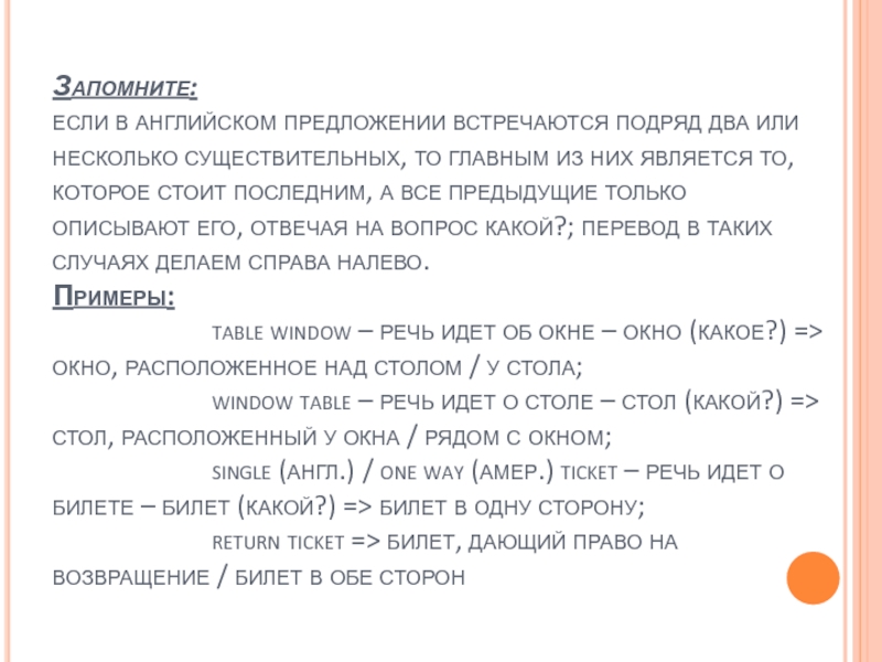 window table – речь идет о столе – стол (какой?) => стол, расположенный у окна / рядом с окном;