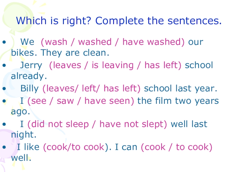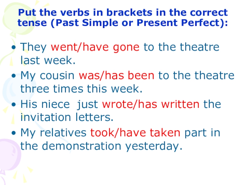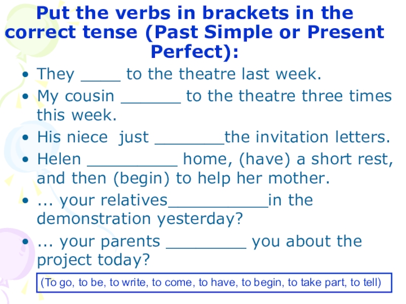 (To go, to be, to write, to come, to have, to begin, to take part, to tell)