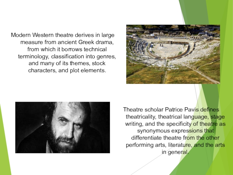 Theatre scholar Patrice Pavis defines theatricality, theatrical language, stage writing, and the specificity of theatre as synonymous expressions that differentiate theatre from the other performing arts, literature, and the arts in general.