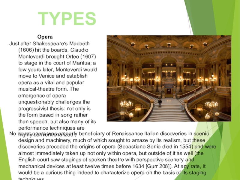 No doubt opera was an early beneficiary of Renaissance Italian discoveries in scenic design and machinery, much of which sought to amaze by its realism, but these discoveries preceded the origins of opera (Sebastiano Serlio died in 1554) and were almost immediately taken up not only within opera, but outside of it as well (the English court saw stagings of spoken theatre with perspective scenery and mechanical devices at least twelve times before 1634 [Gurr 208]). At any rate, it would be a curious thing indeed to characterize opera on the basis of its staging techniques