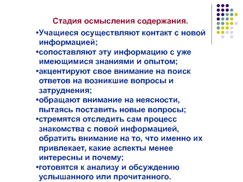 стремятся отследить сам процесс знакомства с повой информацией, обратить внимание на то, что именно их привлекает, какие аспекты менее интересны и почему;