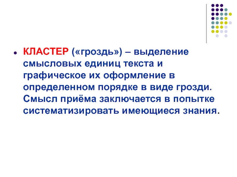 Слайд 15КЛАСТЕР («гроздь») – выделение смысловых единиц текста и графическое их оформление