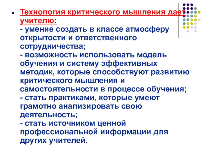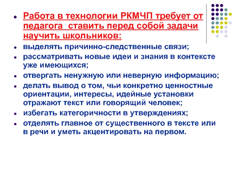 Слайд 8Работа в технологии РКМЧП требует от педагога ставить перед собой задачи научить
