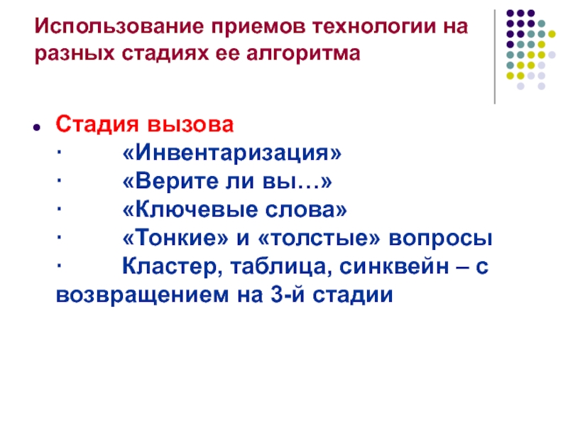 Слайд 11Использование приемов технологии на разных стадиях ее алгоритма