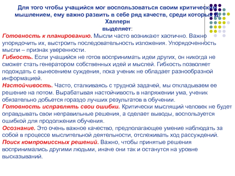 Слайд 9Для того чтобы учащийся мог воспользоваться своим критическим мышлением, ему важно